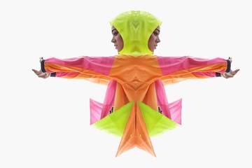 Een aantal items in de collectie is transformative, waardoor de drager ze op verschillende manieren kan dragen. “Het gaat over een utilitaire benadering van design en functie,” zegt Jones. Zo zitten er minder naden in de items, waardoor ze lichter en kleiner aanvoelen.
