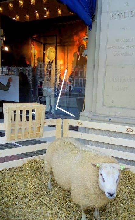 Maison de Bonneterie. Samen met vier schapen is de schapenboer van Texel naar Amsterdam gereisd, voor de start van de Nederlandse Wolcampagne, om het gebruik van wol in de modeindustrie te stimuleren.